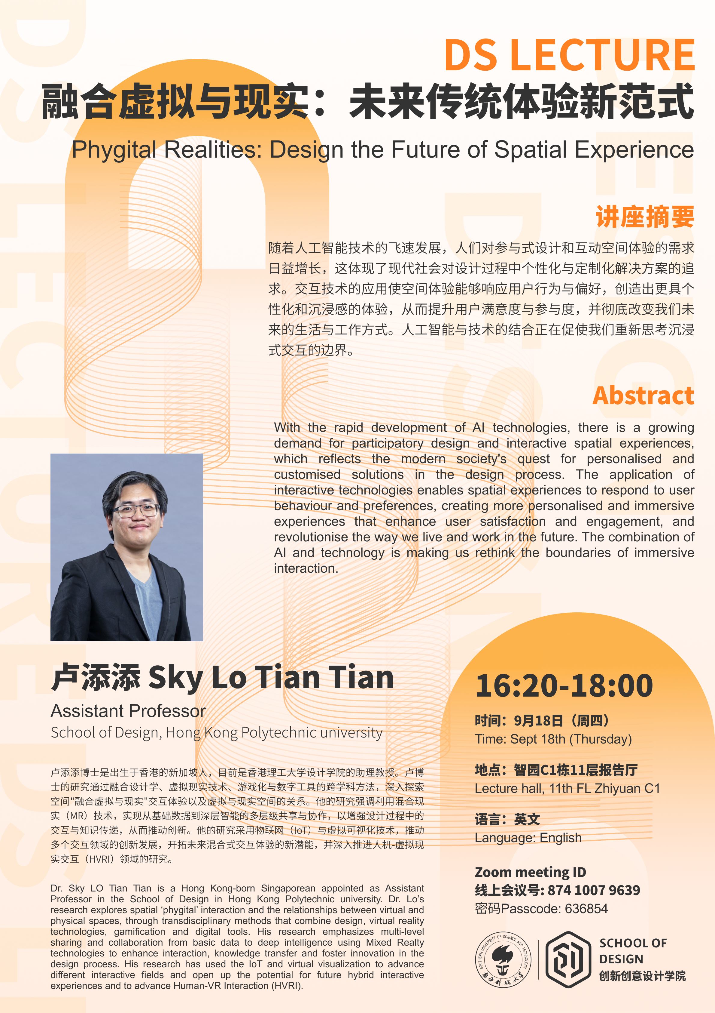 Dr. Sky Lo Tian Tian is a Hong Kong-born Singaporean appointed as Assistant Professor in the School of Design in Hong Kong Polytechnic university. Dr. Lo’s research explores spatial ‘phygital’ interaction and the relationships between virtual and physical spaces, through transdisciplinary methods that combine design, virtual reality technologies, gamification and digital tools. His research emphasizes multi-level sharing and collaboration from basic data to deep intelligence using Mixed Realty technologies to enhance interaction, knowledge transfer and foster innovation in the design process. His research has used the IoT and virtual visualization to advance different interactive fields and open up the potential for future hybrid interactive experiences and to advance Human-VR Interaction (HVRI).