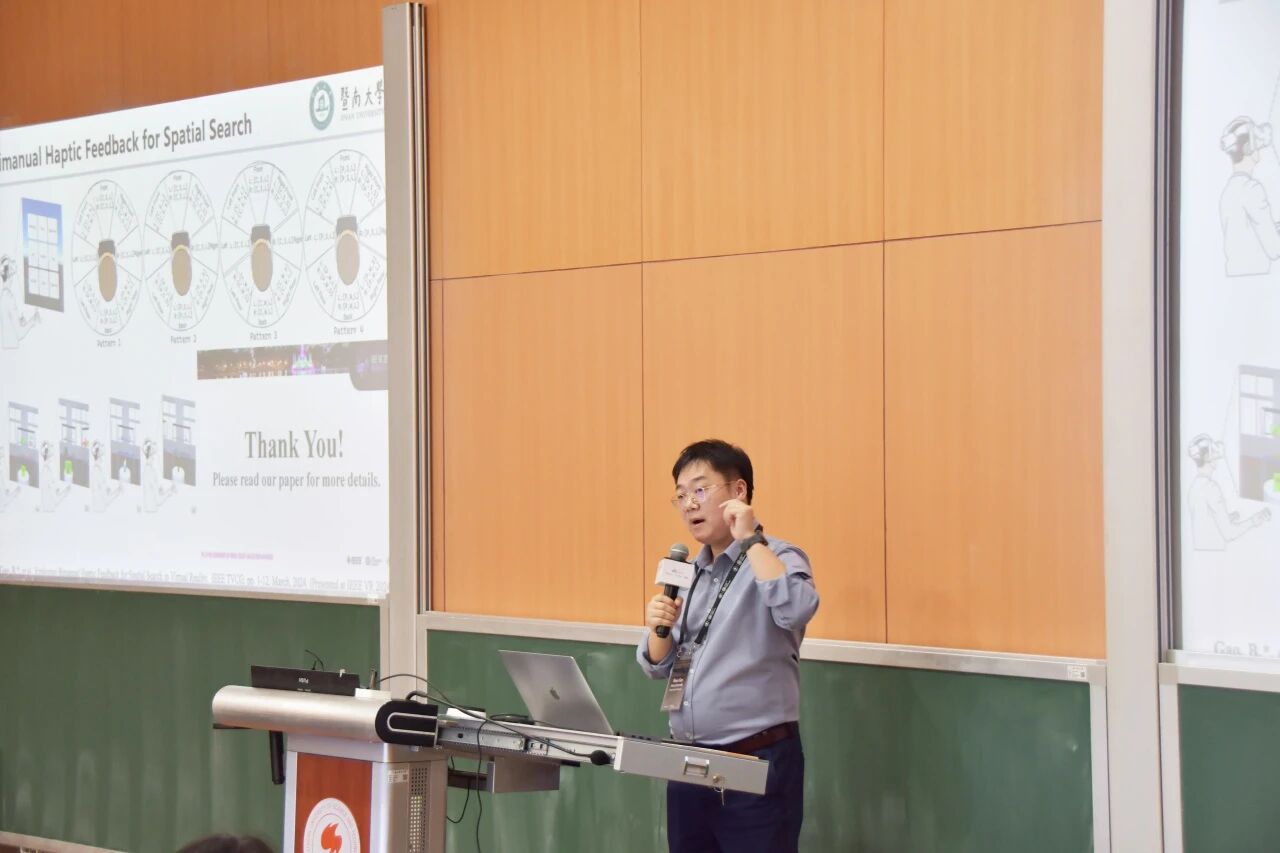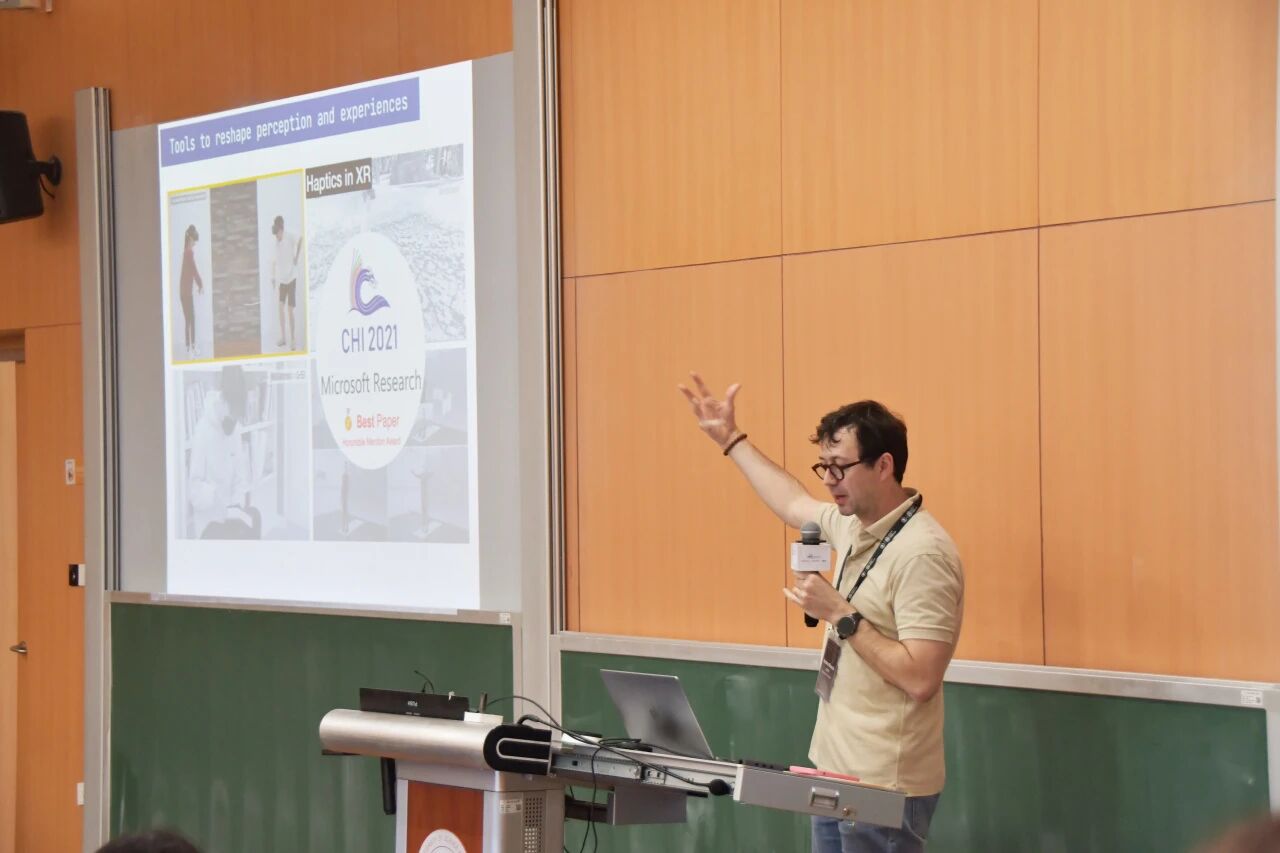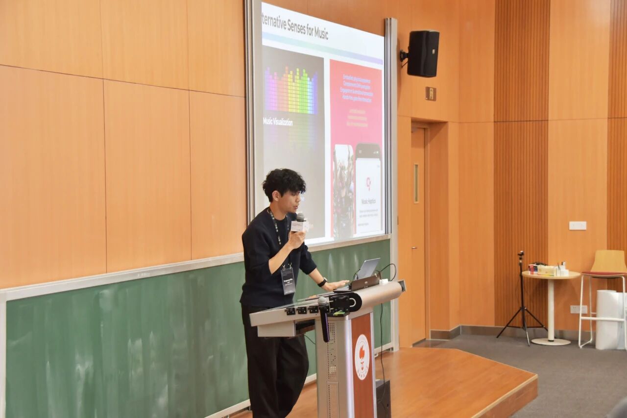 Senior Researcher Sungyong Shin presented a multisensory music learning system designed for deaf and hard-of-hearing individuals. By integrating visual cues, tactile feedback, and spatial signals, the system helps users understand rhythm and melody in music. He explained how vibration, rhythm visualization, and structured prompts are combined within the system, and demonstrated its application in real teaching scenarios, showing how multisensory experiences can effectively enhance learners’ motivation and engagement.
